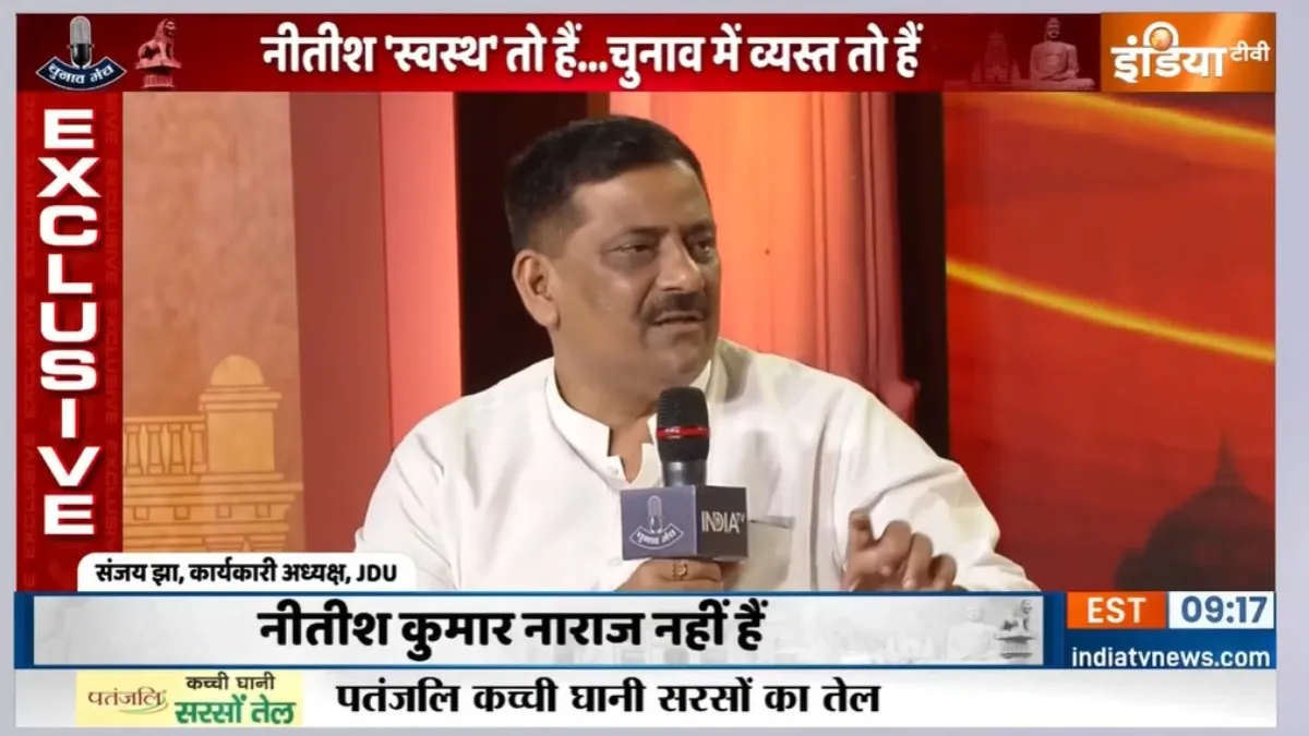 इंडिया टीवी पर इस सवाल का जवाब देते हुए कि NDA के घटक दलों में कोई नाराजगी तो नहीं है, संजय झा ने कहा, 'नहीं, नहीं। हम लोगों का तो कैंपेन शुरू हो गया है। आज फर्स्ट फेज का नॉमिनेशन भी कंप्लीट हो गया। कल तक लगभग सारे नॉमिनेशन कंप्लीट हो जाएंगे। जिस तरह नंबर डिसाइड हुआ, सब कुछ बहुत अच्छी तरह हुआ। एनडीए एक यूनिट की तरह चुनाव लड़ रहा है। कहीं कोई गैप नहीं है। किसी भी तरह की कोई नाराजगी नहीं है।' उन्होंने यह भी कहा कि नीतीश कुमार की नाराजगी की खबरें भी पूरी तरह झूठी थीं।