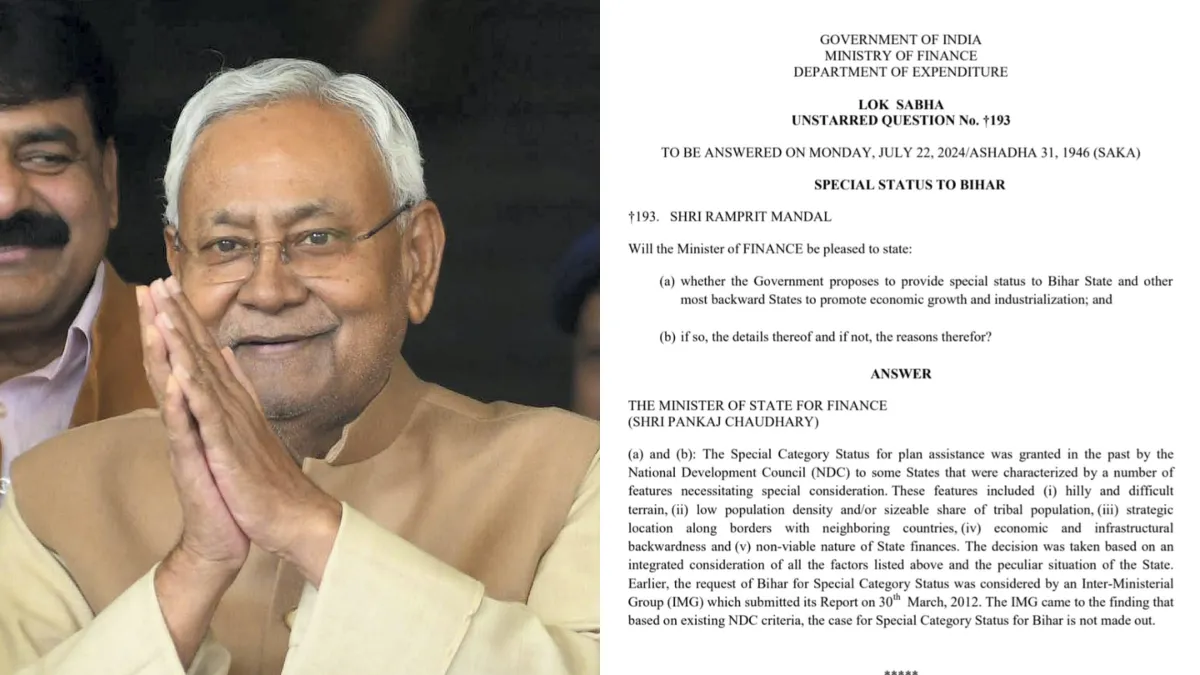 वित्त राज्य मंत्री पंकज चौधरी के लिखित जवाब में कहा गया है कि बिहार को विशेष राज्य का दर्जा न देने का फैसला इन पांचों कारकों को ध्यान में रखते हुए राज्य की विशिष्ट स्थिति पर अलग से विचार करने के बाद लिया गया। इससे पहले, विशेष श्रेणी के दर्जे के लिए बिहार के अनुरोध पर एक अंतर-मंत्रालयी समूह (आईएमजी) ने विचार किया था, जिसने 30 मार्च, 2012 को अपनी रिपोर्ट प्रस्तुत की थी। आईएमजी इस निष्कर्ष पर पहुंचा था कि मौजूदा एनडीसी मानदंडों के आधार पर बिहार के लिए विशेष श्रेणी के दर्जे का मामला नहीं बनता है।