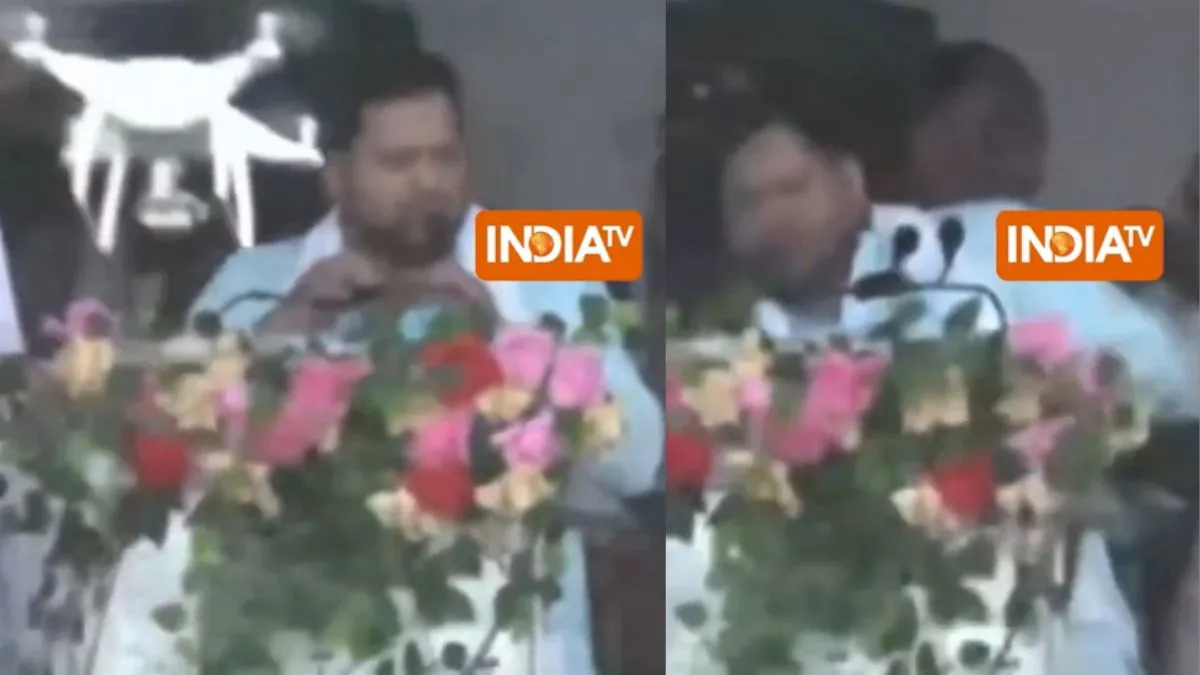 पटना: राष्ट्रीय जनता दल के नेता तेजस्वी यादव आज पटना में भाषण के दौरान बाल-बाल बच गए। यहां वह वक्फ बचाओ, संविधान बचाओ रैली को संबोधित कर रहे थे। इसी बीच एक ड्रोन उड़ता हुआ उनके पास आया और जिस पोडियम के पास खड़े होकर वह भाषण दे रहे थे, उससे ड्रोन टकरा गया। हालांकि तेजस्वी यादव ने तुरंत झुककर खुद को बचाया। इसका वीडियो भी सामने आया है, जो सोशल मीडिया पर जमकर वायरल हो रहा है। इस दौरान तेजस्वी यादव का भाषण भी बीच में रुक गया। हालांकि ड्रोन के गिरने के बाद उन्होंने अपना भाषण फिर से शुरू किया।
