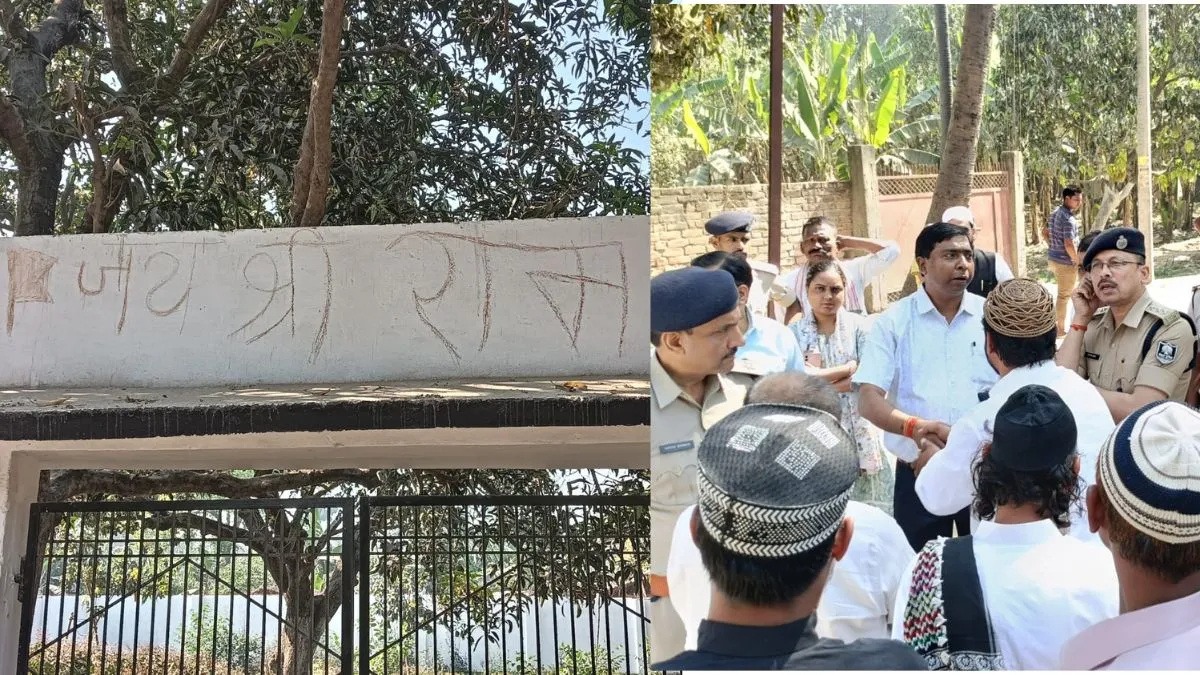 हाजीपुर: बिहार के हाजीपुर में ईद के मौके पर माहौल को बिगाड़ने की कोशिश की गई है। असामाजिक तत्वों ने ईदगाह के गेट पर 'जय श्री राम' लिख दिया। इस घटना के बाद इलाके में तनाव फैल गया, जिसके बाद खबर मिलते ही पुलिस और प्रशासन ने फौरन मोर्चा संभाला और हालात को सामान्य करने की कोशिश की। पुलिस की देखरेख में ईदगाह की दीवार पर लिखे गए सभी शब्दों को मिटा दिया गया है।