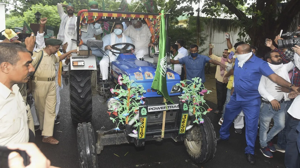 पटना: केंद्र सरकार द्वारा पिछले दिनों संसद से पास कराए गए कृषि विधेयक के खिलाफ शुक्रवार को देशभर में किसान संगठन और विपक्षी दल विरोध प्रदर्शन के लिए सड़क पर उतरे हैं। इस बीच, राष्ट्रीय जनता दल (राजद) के कार्यकर्ता अपने नेता तेजस्वी यादव के नेतृत्व में पटना की सड़कों पर उतरे। तेजस्वी ने पटना की सड़कों पर ट्रैक्टर चलाया। राजद ने कृषि बिल को किसान विरोधी बताते हुए शुक्रवार को राज्य के सभी जिला मुख्यालयों में प्रदर्शन करने का निर्णय लिया है।