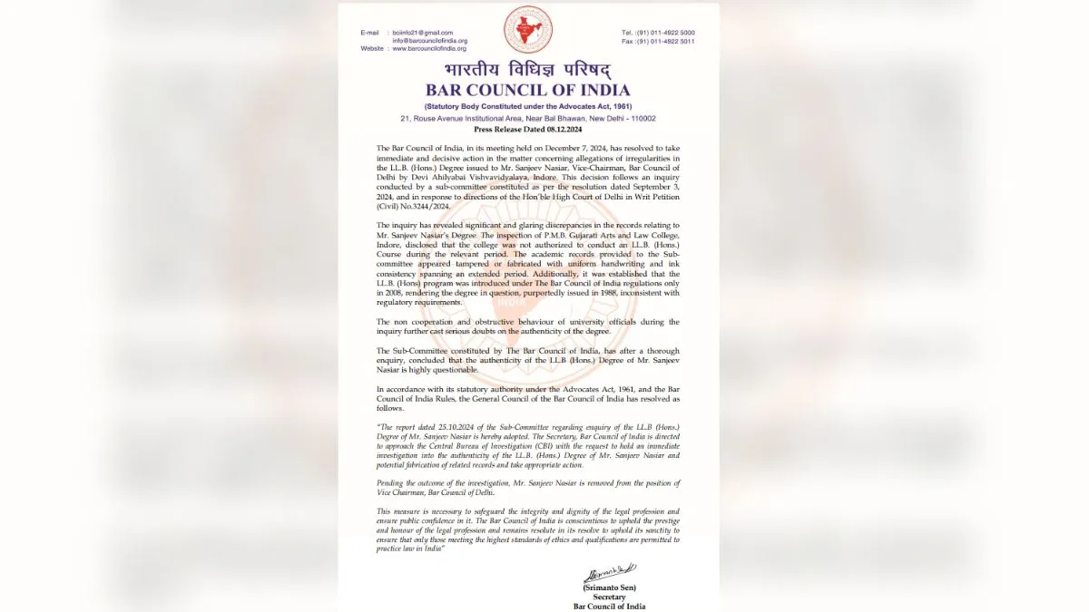 आपको बता दें कि 7 दिसंबर को बार काउंसिल ऑफ इंडिया की एक बैठक हुई। इसके बाद BCI ने यह निर्देश दिया है। निर्देश में BCI ने लिखा, '7 दिसंबर को हुई बैठक में देव अहिल्याबाई विश्वविद्याल, इंदौर द्वारा दिल्ली बार काउंसिल के उपाध्यक्ष संजीव नासियार को जारी की गई LLB की डिग्री में अनियमितताओं के आरोपों के संबंध में तत्काल और निर्णायक कार्रवाई करने का फैसला लिया है। यह निर्णय 3 सितंबर 2024 के संकल्प के अनुसार गठित एक उप समिति द्वारा की गई जांच और रिट याचिका में दिल्ली उच्च न्यायालय के निर्देशों के जवाब में लिया गया है।'