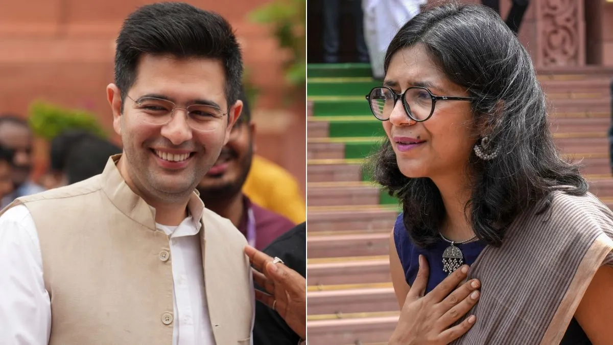 Image Source : PTI आप के राज्यसभा सांसद राघव चड्ढा और स्वाति मालीवाल