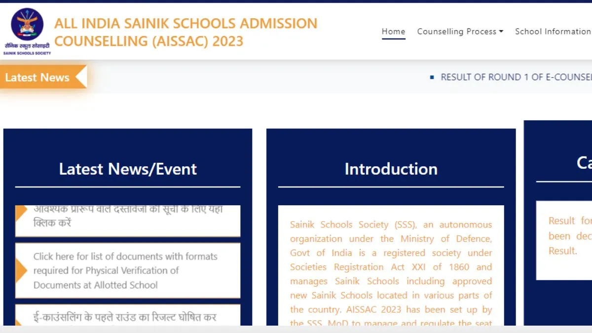 ऑल इंडिया सैनिक स्कूल एडमिशन काउंसलिंग (AISSAC 2023) ने एडमिशन के लिए ई-काउंसलिंग रिजल्ट जारी कर दिया है। एडमिशन लेने के वे इच्छुक उम्मीवार जो काउंसलिंग में शामिल हुए हो, आधिकारिक वेबसाइट pesa.ncog.gov.in/sainikschoolecounselling पर जाकर अभी अपना सीट अलॉटमेंट रिजल्ट देख सकते हैं। बता दें कि रिजल्ट देखने के लिए उम्मीदवारों को यूजरनेम और पासवर्ड की जरूरत पड़ेगी। वर्ष 2023 में AISSEE के लिए क्वालिफाई हुए उम्मीदवार, जिन्होंने सैनिक स्कूल में एडमिशन के लिए आवेदन किया था, वे लॉगिन पोर्टल के जरिए पहले चरण के सीट अलॉटमेंट रिजल्ट को चेक और डाउनलोड कर सकते हैं।