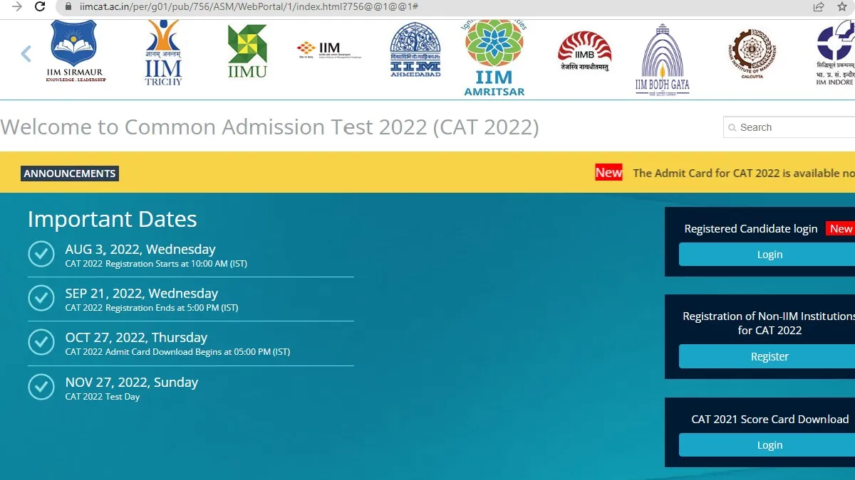 कॉमन एडमिशन टेस्ट, CAT-2022 का Admit Card जारी हो चुका है। इंडियन इंस्टीट्यूट ऑफ मैनेजमेंट (IIM) बेंगलुरु ने CAT की ऑफिशियल वेबसाइट पर CAT Admit Card-2022 लिंक जारी किया है। जो छात्र एंट्रेस एग्जाम देने जा रहे हैं, वे लॉग इन पोर्टल iimcat.ac.in के जरिए अपना एडमिट कार्ड देखकर डाउनलोड कर सकते हैं। एडमिट कार्ड तक पहुंचने के लिए अभ्यर्थियों को अपने यूजर आईडी और पासवर्ड की जरूरत पड़ेगी। छात्र यहां बताए गए तरीकों से IIM CAT एडमिट कार्ड डाउनलोड कर सकते हैं।