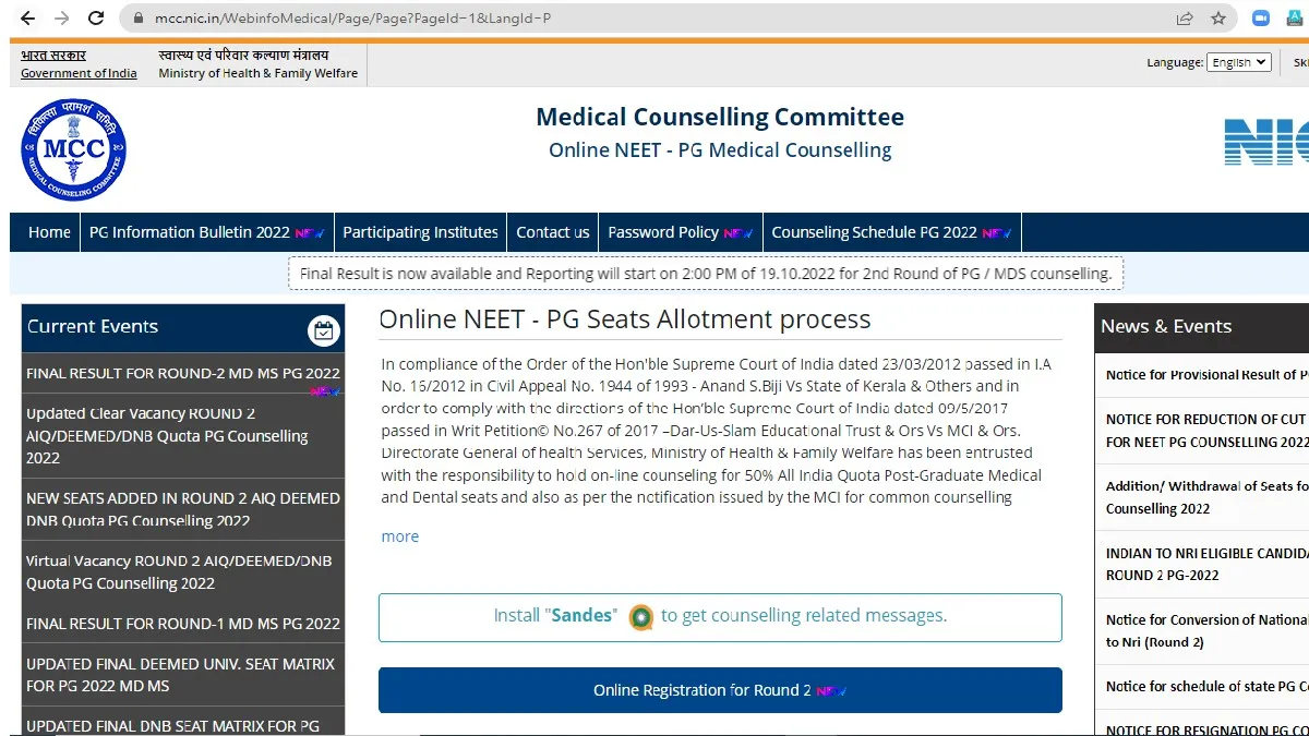 NEET PG Counselling 2022: मेडिकल काउंसलिंग कमेटी (MCC) ने 19 अक्टूबर को NEET PG 2022 काउंसलिंग राउंड 2 का फाइनल रिजल्ट (NEET PG Counselling 2022) घोषित कर दिया है।उम्मीदवार ऑफिशियल वेबसाइट mcc.nic.in पर NEET PG 2022 राउंड 2 के फाइनल रिजल्ट को चेक कर सकते हैं। उम्मीदवारों को राउंड 2 का रिजल्ट चेक करने के लिए रोल नंबर और पासवर्ड सबमिट करना होगा। राउंड 2 काउंसलिंग फाइनल सीट अलॉटमेंट रिजल्ट के साथ, MCC ने अलॉटेड संस्थानों में रिपोर्टिंग प्रक्रिया भी शुरू कर दी है।