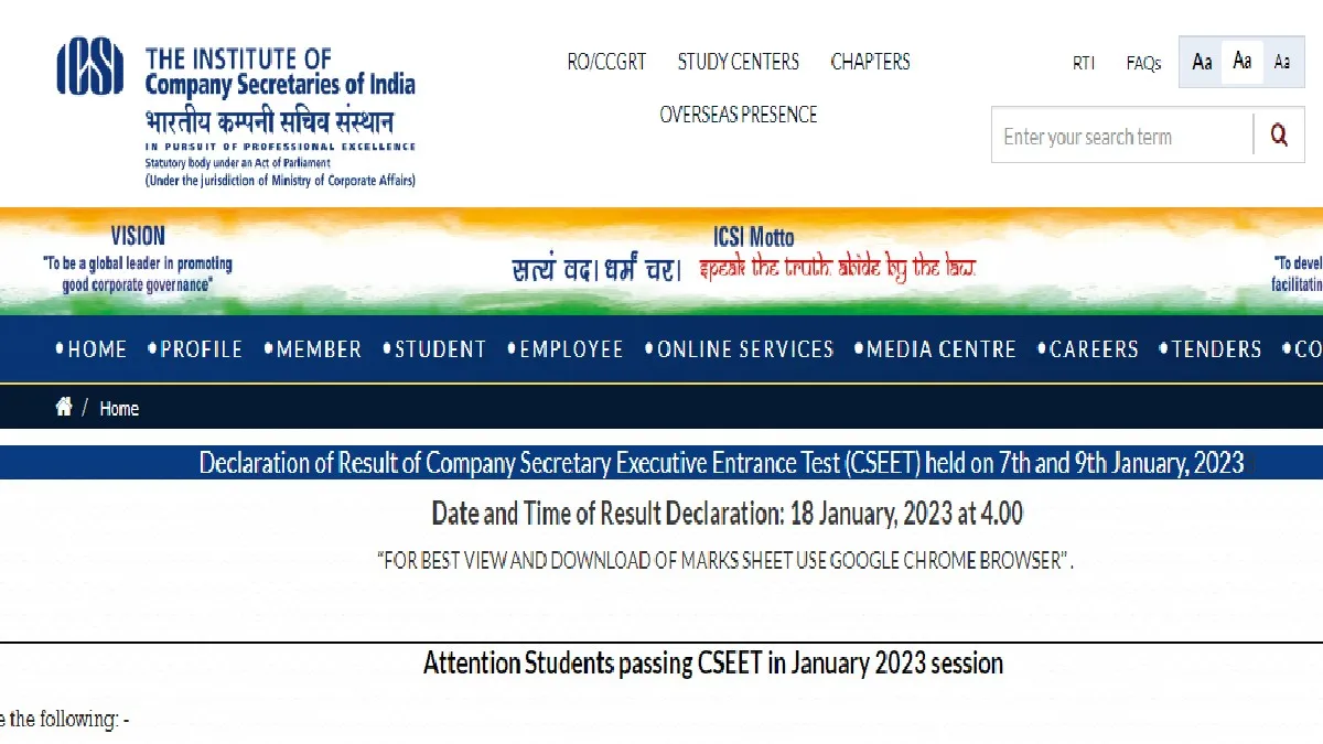 CSEET January 2023 result Out: भारतीय कंपनी सचिव संस्थान(ICSI) की तरफ से CS एग्जिक्यूटिव एंट्रेंस टेस्ट(CSEET)जनवरी 2023 की रिजल्ट 18 जनवरी 2023 यानी आज बुधवार को घोषित कर दिया गया है। कैंडिडेट्स को बताया जाता है कि ICSI CSEET जनवरी 2023 का रिजल्ट आधिकारिक वेबसाइट पर जारी किया गया है। जो कैंडिडेट्स इस परीक्षा में शामिल हुए थे,अब वे अपने रिजल्ट को ऑफिशियल वेबसाइट icsi.edu पर जाकर चेक व डाउनलोड कर सकते हैं।