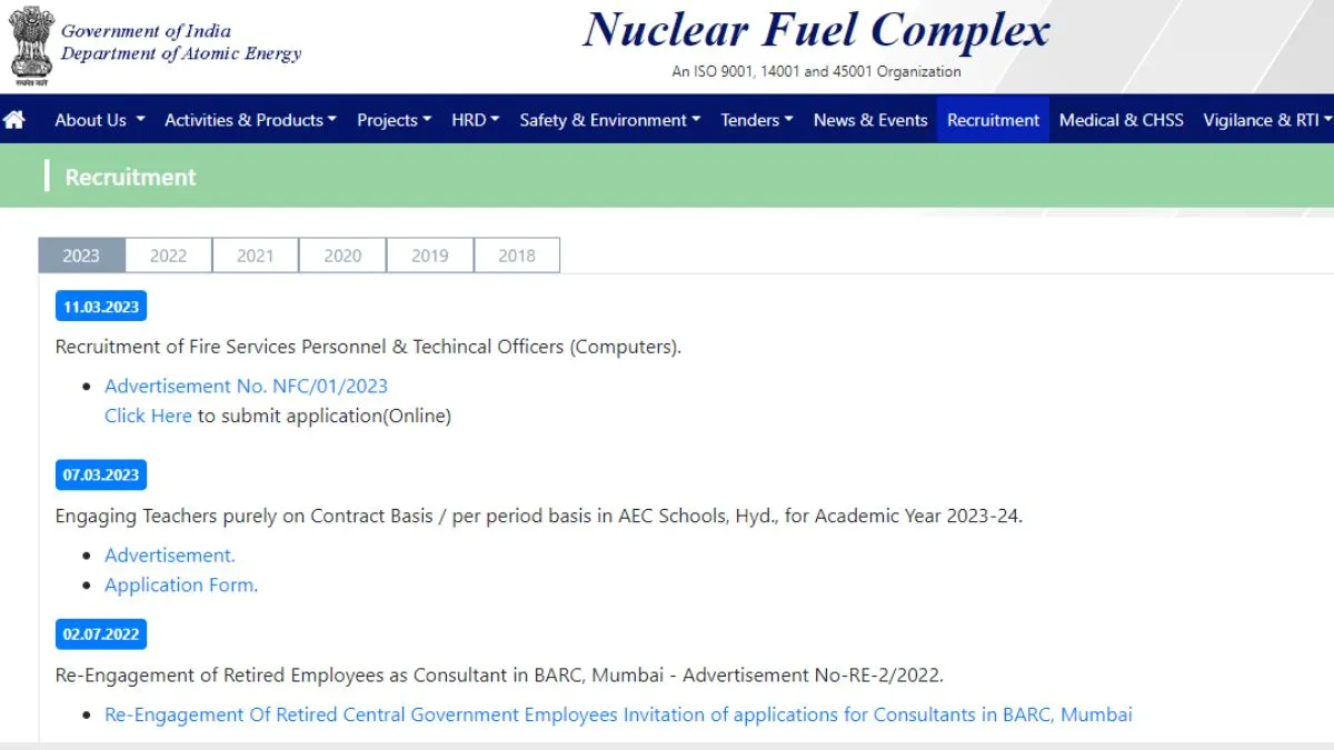 एटोमिक एनर्जी डिपार्टमेंट में काम करना चाहते है तो ये खबर आपके लिए बहुत उपयोगी है। एटोमिक एनर्जी डिपार्टमेंट ने एक भर्ती नोटिफिकेशन जारी किया है। नोटिफिकेशन के मुताबिक, डिपार्टमेंट ऑफ एटॉमिक एनर्जी ने चीफ फायर ऑफिसर, टेक्निकल ऑफिसर, डिप्टी चीफ फायर ऑफिसर और अन्य पदों पर भर्ती के लिए आवेदन आमंत्रित किए हैं। इस भर्ती के लिए आवेदन प्रक्रिया चल रही है और आवेदन पत्र जमा करने की अंतिम तारीख 10 अप्रैल है। जो उम्मीदवार इस भर्ती में भाग लेने के इच्छुक हो, आधिकारिक वेबसाइट www.nfc.gov.in के माध्यम से ऑनलाइन आवेदन कर सकते हैं।
