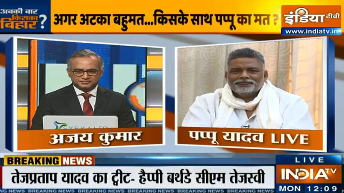 पटना/नई दिल्ली: जन अधिकार पार्टी के अध्यक्ष पप्पू यादव से इंडिया टीवी ने खास बातचीत की। बातचीत के दौरान पप्पू यादव ने एक तरफ RJD पर निशाना साधा तो दूसरी ओर यह भी माना की मुख्यमंत्री नीतीश कुमार के खिलाफ राज्य में गुस्सा था। उन्होंने कहा कि मजदूरों और कर्मचारियों का गुस्सा नीतीश कुमार के लिए सही नहीं था, इसके कारण JDU की सीटें घटेंगी। लेकिन, उनका मानना है कि इस बार भाजपा पहले से मजबूत स्थिति में है।