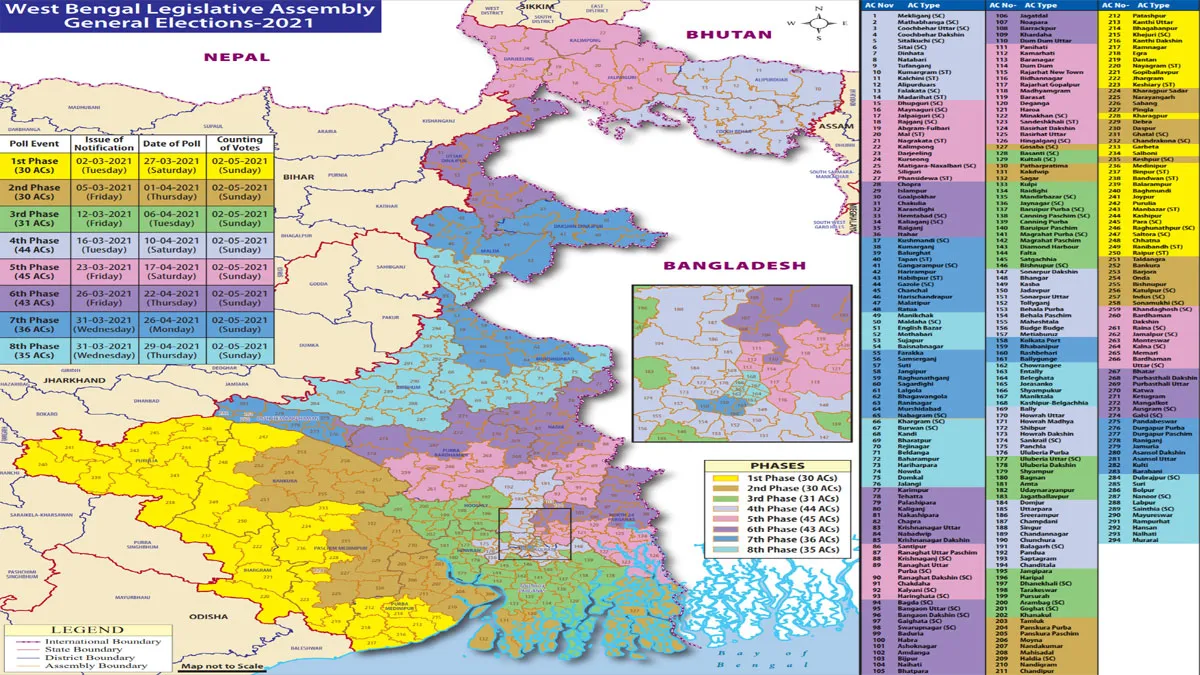 पश्चिम बंगाल में पहले चरण के लिए 27 मार्च, दूसरे चरण के लिए 1 अप्रैल, तीसरे चरण के लिए 6 अप्रैल, चौथे चरण के लिए 10 अप्रैल, पांचवें चरण के लिए 17 अप्रैल, छठे के लिए 22 अप्रैल, सातवें के लिए 26 अप्रैल और आठवें चरण के लिए 29 अप्रैल को मतदान होना है। पश्चिम बंगाल सहित 5 राज्यों में होने वाले चुनाव के लिए मतगणना 2 मई को होने जा रही है।