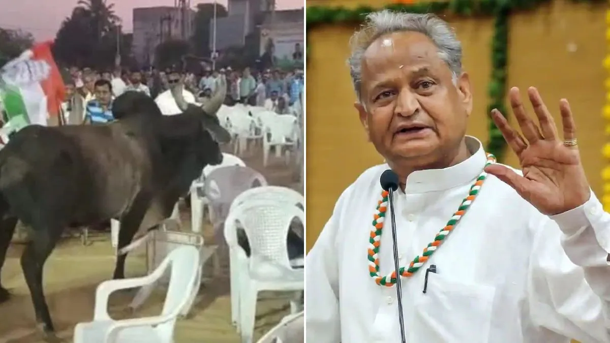 अशोक गहलोत ने माहौल ठीक होते ही सभा को संबोधित करना शुरू किया और बीजेपी को कोसा। गहलोत ने कहा, ''ये गाय और सांड जो है मैं बचपन से देखता आ रहा हूं। जब कभी कांग्रेस की मीटिंग होती है तो ये बीजेपी वाले सांड या गाय को भेज देते हैं मीटिंग को डिस्टर्ब करने के लिए। ये कोई नई बात नहीं है।'' उन्होंने अफरातफरी को देखते हुए लोगों को समझाते हुए कहा, ''आपलोग शांत रहो, ये लोग इसे निकाल देंगे चुपचाप। ये फितरत है बीजेपी वालों की...गायों को, सांडों को भेज देते हैं कांग्रेस की मीटिंग में।'' थोड़ी देर बाद सांड निकल जाता है।
