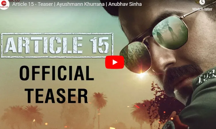 मुंबई: आयुष्मान खुराना की मोस्ट अवेटेड फिल्म 'आर्टिकल 15' का धमाकेदार टीजर आज रिलीज हो गया। इस फिल्म की कहानी संविधान के आर्टिकल 15 के बारे में है। फिल्म के अभिनेता आयुष्मान खुराना ने टीजर शेयर किया है, इस टीजर में आयुष्मान संविधान के आर्टिकल 15 के बारे में बात करते दिखाई दे रहे हैं। इस आर्टिकल में धर्म, जाति, लिंग, नस्ल या जन्मस्थान की वजह से किसी से भेदभाव करने के बारे में है।