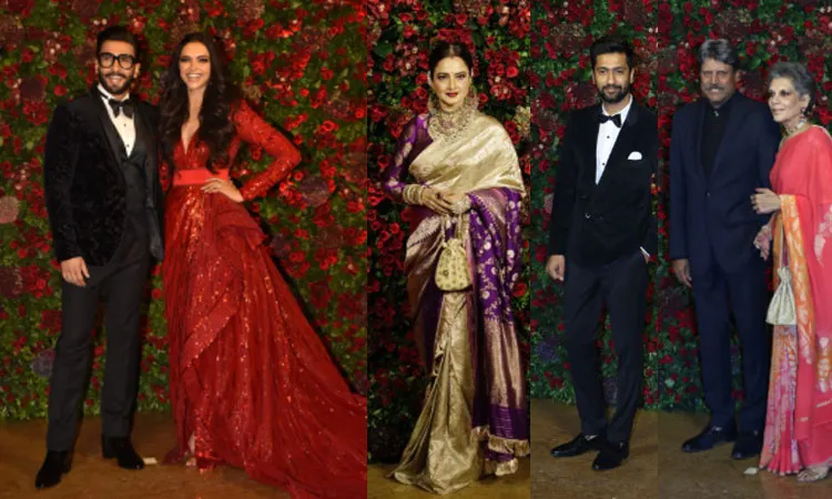 Deepika Padukone-Ranveer Singh Reception: दीपिका पादुकोण और रणवीर सिंह का रिसेप्शन शुरू हो चुका है। इस रिसेप्शन पार्टी में रेखा, कपिल देव, विक्की कौशल, मनीष पॉली, विधु विनोद चोपड़ा समेत कई मेहमानों ने शिरकत की है। दीपिका और रणवीर ने शादी की थीम रेड और ब्लैक रखी है, सभी मेहमान उसी हिसाब से पहुंच रहे हैं। इस रिसेप्शन पार्टी में आज सितारों ने पहुंचकर चार चांद लगा दिया है। देखिए तस्वीरें...