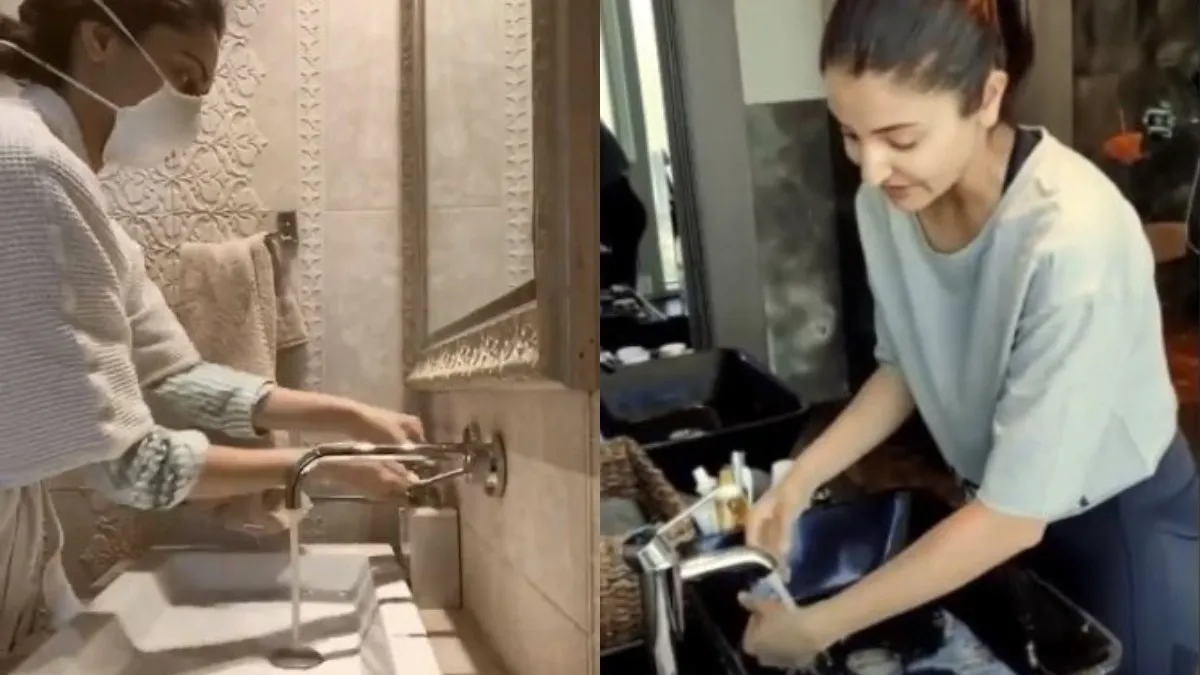 अनुष्का शर्मा हैंड वाश का इस्तेमाल करते हुए