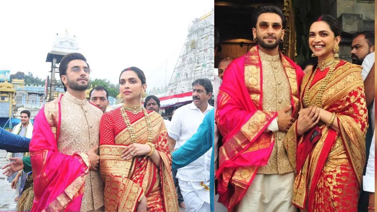 मुंबई: बॉलीवुड के मोस्ट लविंग कपल दीपिका पादुकोण और रणवीर सिंह आज अपनी शादी की पहली सालगिरह मना रहे हैं। ग्रैंड पार्टी ना करके वो इसे ट्रैडिश्नल अंदाज में मना रहे हैं। दोनों सुबह-सुबह आंध्रप्रदेश के तिरुमाला तिरुपति में मौजूद वेंकेटश्वर मंदिर पहुंचे। यहां दोनों ने पूजा अर्चना की। इस मौके पर दीपिका पादुकोण ने लाल रंग की बेहद प्यारी साड़ी पहनी थी, साथ में उन्होंने गोल्डन ज्वैलरी पहनी थी, वहीं रणवीर सिंह भी एथनिक अवतार में नजर आए।