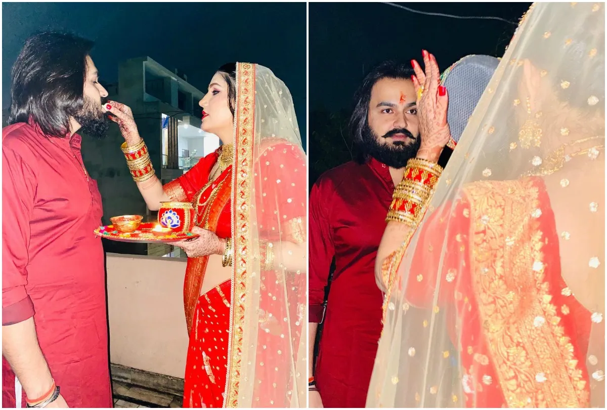 शेयर की गई तस्वीरों में सपना के पति वीर साहू भी नजर आ रहे हैं। सपना इन तस्वीरों में अपने व्रत खोलने की रस्म करते हुए दिखाई दीं। सपना चांद को देखने के बाद अपने पति को देख रही हैं तो वहीं उन्हें मिठाई खिलाती भी दिखाई दीं।
