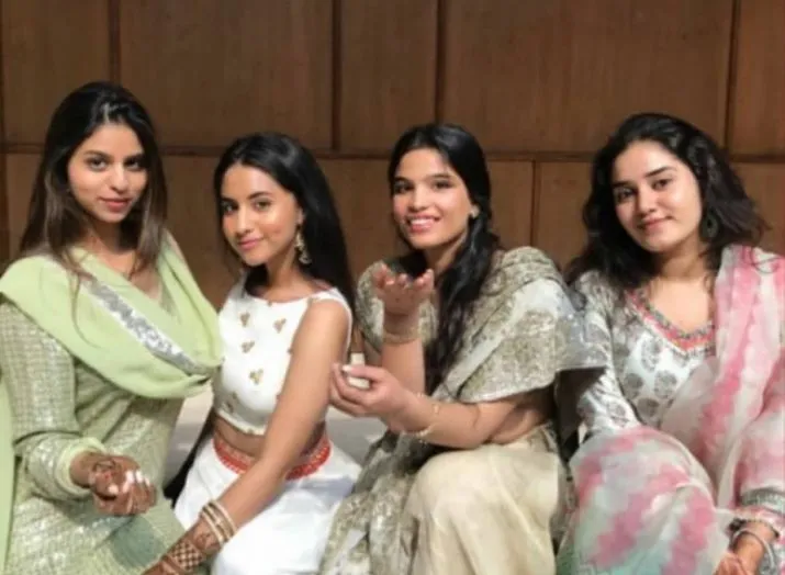 सुहाना खान इस फोटो में अपने कजिन्स के साथ मस्ती कर रही हैं। यह शादी के फंक्शन की फोटो है। यह फोटो सुहाना की कजिन आलिया चिब्बा ने शेयर की है। यह फोटो मेंहदी के फंक्शन की है जिसमें सुहाना मिंट ग्रीन कलर का सूट जिसपर सिल्वर कलर की एम्बॉयडरी हुई है। इसके साथ ही उनसे हाथों में मेंहदी लगी हुई है।