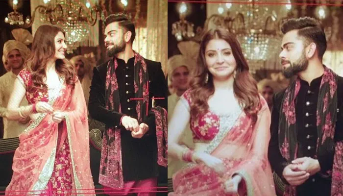 नई दिल्ली: बॉलीवुड अभिनेत्री अनुष्का शर्मा और भारतीय क्रिकेट कैप्टन विराट कोहली की जोड़ी लोगों का काफी पसंद है। वैसे भी क्रिकेट और बॉलीवुड का पुराना याराना है। जब भी ये जोड़ी साथ नजर आती हैं लोगों की निगाह सिर्फ इन्हीं पर रहती हैं। विराट कोहली अक्सर अपने सोशल मीडिया अकाउंट पर अनुष्का के साथ तस्वीरें शेयर करते हैं। इस बार भी विराट और अनुष्का की कुछ तस्वीरें इंटरनेट पर वायरल हो रही हैं, मगर इस बार ये तस्वीरें विराट ने नहीं बल्कि विराट और अनुष्का के फैंस शेयर कर रहे हैं। हाल ही में विराट कोहली और अनुष्का एथनिक में नजर आए। जहां विराट ने शेरवानी पहनी थी वहीं अनुष्का लहंगे में नजर आ रही हैं। तस्वीर देखकर लग रहा है जैसे दोनों किसी शादी के फंक्शन में साथ गए हों। लेकिन हम आपको बता दें ये तस्वीरें किसी शादी के फंक्शन की नहीं है बल्कि एक विज्ञापन के शूटिंग की हैं।