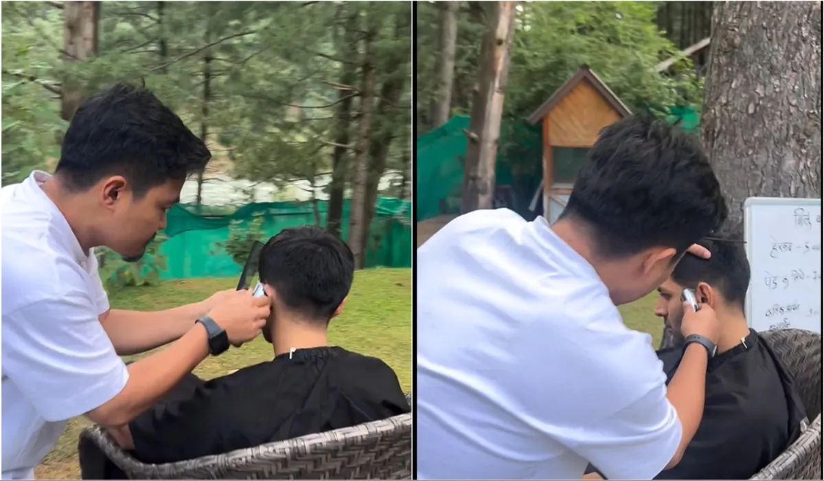 पेड़ के नीचे बैठकर बाल कटवाते दिखे कार्तिक