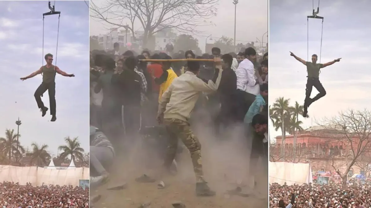 सामने आए इस वीडियो में आप देख सकते हैं कि अक्षय और टाइगर एक्शन स्टंट दिखाते हुए एंट्री लेते नजर आ रहे हैं। लखनऊ के घंटाघर से स्टेज तक का रास्ता अक्षय-टाइगर ने एरियल के सहारे लटके हुए तय किया। इस दौरान दोनों स्टार्स ने रस्सी के लटकते हुए कई करतब भी दिखाए। वहीं स्टार्स का ये स्टंट करते देख नीचे खड़ी पब्लिक चिखती चिल्लाती दिख रही है। इतना ही नहीं इसके बाद गहमागहमी का माहौल इतना बना कि भीड़ ने एक दूसरे पर चप्पलों की बरसात कर दी। वीडियो को आप ध्यान से देखें तो इसमें आपको हवा में चप्पलें उड़ती हुई दिखाई देगी। इस हंगामे को कंट्रोल करने के लिए सुरक्षा बलों को लाठीचार्ज भी करना पड़ा। फिलहाल अक्षय कुमार और टाइगर श्रॉफ के इवेंट में हुए इस बवाल की हर तरफ चर्चा हो रही है। इवेंट से जुड़े कई वीडियोज सोशल मीडिया पर वायरल हो रहे हैं।