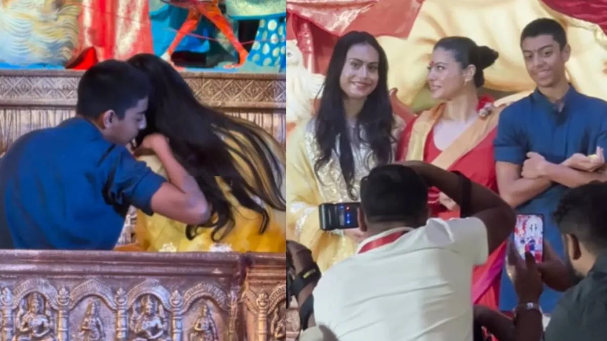 बॉलीवुड अभिनेत्री काजोल इन दिनों दुर्गा पूजा में व्यस्त चल रही हैं और उनके साथ-साथ उनका पूरा परिवार भी इस 9 दिनों के पर्व को मनाने में व्यस्त है। इंटरनेट पर काजोल की दुर्गा पूजा के वीडियो-फोटोज छाए हुए हैं। बीते दिन भी काजोल की दुर्गा पूजा के कई वीडियो सामने आए, जिसमें रानी मुखर्जी, तनीषा मुखर्जी और अयान मुखर्जी भी काजोल के साथ दिखाई दिए। अब काजोल आज फिर दुर्गा पंडाल पहुंचीं और इस दौरान उनके दोनों बच्चे नीसा और युग भी उनके साथ नजर आए। अब दुर्गा पंडाल से युग और नीसा के कई वीडियो सामने आए हैं, जिसमें दोनों को कभी कानाफूसी करते तो कभी एक-दूसरे पर प्यार लुटाते देखा जा सकता है।