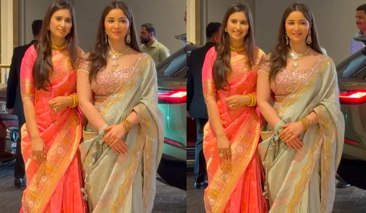 दोनों डीवाज सानिया चंडोक और सारा तेंदुलकर ने बारीक कारीगरी वाली शानदार साड़ियों में सबका ध्यान अपनी ओर खींचा। सारा ने हल्के हरे रंग की साड़ी चुनी, जिसके साथ उन्होंने भारी कढ़ाई वाला ब्लाउज पहना था, वहीं सानिया ने पीच कलर की सिल्क साड़ी में लाइमलाइट लूट ली। सानिया चंडोक ने पीच-गुलाबी सिल्क साड़ी में अपनी सादगी और खूबसूरती से सभी का दिल जीत लिया। इस साड़ी के बॉर्डर पर बारीक जरी का काम था, जिसमें हल्के सुनहरे रंग के फूलों और सुंदर आकृतियों की कढ़ाई की गई थी। उन्होंने इस साड़ी के साथ मैचिंग पीच-गुलाबी ब्लाउज पहना था।