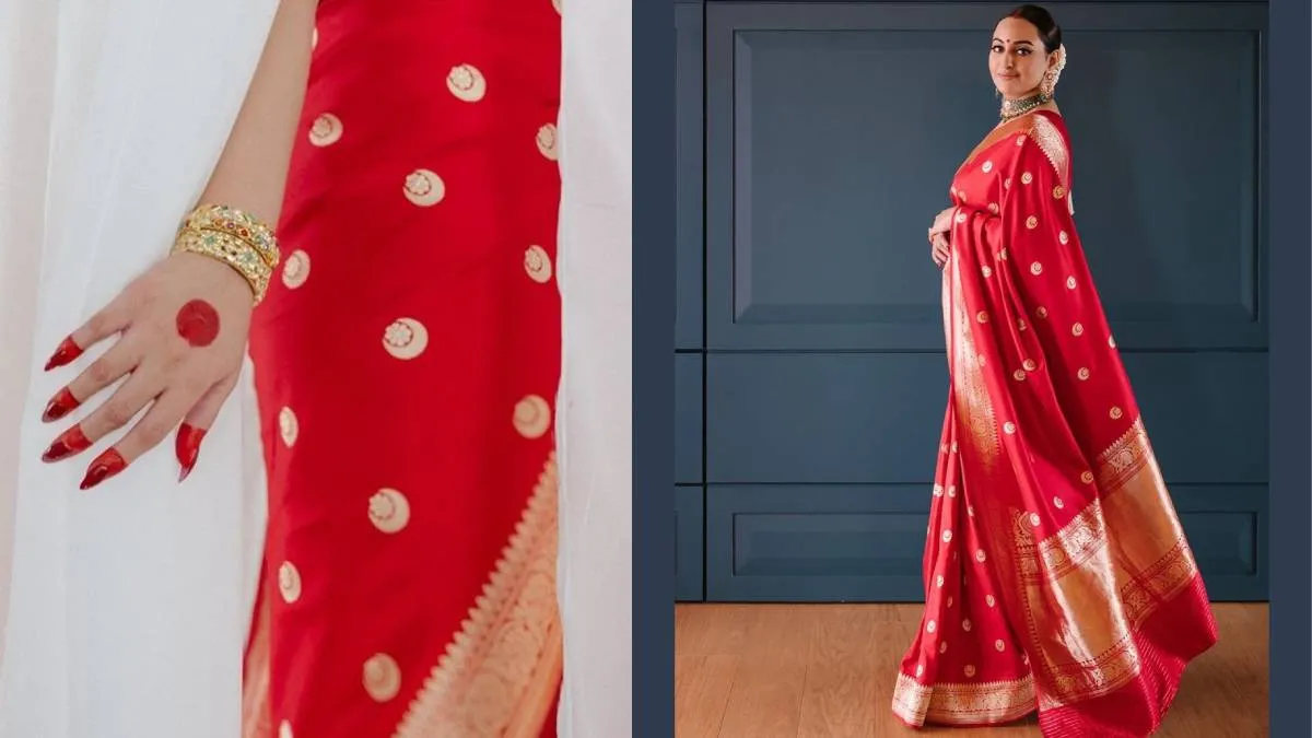 सामने आई तस्वीरों पर अगर आप नजर डालेंगे तो देखेंगे कि सोनाक्षी सिन्हा की लाल साड़ी पर गोल्डन वर्क किया गया है। सिल्क की इस साड़ी पर बूटा स्टाइल जरी वर्क है। एक्ट्रेस की इस साड़ी को रॉ मैंगो से लिया गया है। एक्ट्रेस ने इसकी जानकारी भी खुद अपने इंस्टाग्राम हैंडल पर साझा की है। सोनाक्षी की साड़ी एक चाँद बूटा वाराणसी सिल्क ब्रोकेड साड़ी है। इस बनारसी साड़ी के साथ उन्होंने हाथों में गोल्डन चूड़े, गले में ग्रीन स्टोन वाला चोकर और कानों में बड़े इयररिंग कैरी किए। अब बात करें एक्ट्रेस की साड़ी की कीमत की तो इसे आप 79800 रुपये में खरीद सकते हैं। एक्ट्रेस की ये साड़ी हैंड वोवन (हाथों से बुनी हुई) है। सोनाक्षी सिन्हा की ये साड़ी वेटलेस ऑर्नामेंटेशन साड़ी है, जिसे डिजाइन करने के लिए 18वीं सदी से इंस्पीरेशन लिया गया है। इस साड़ी को खास तौर पर ऑडर देने पर तैयार किया जाता है और इसे बनाने में 4-5 हफ्ते का वक्त लगता है।