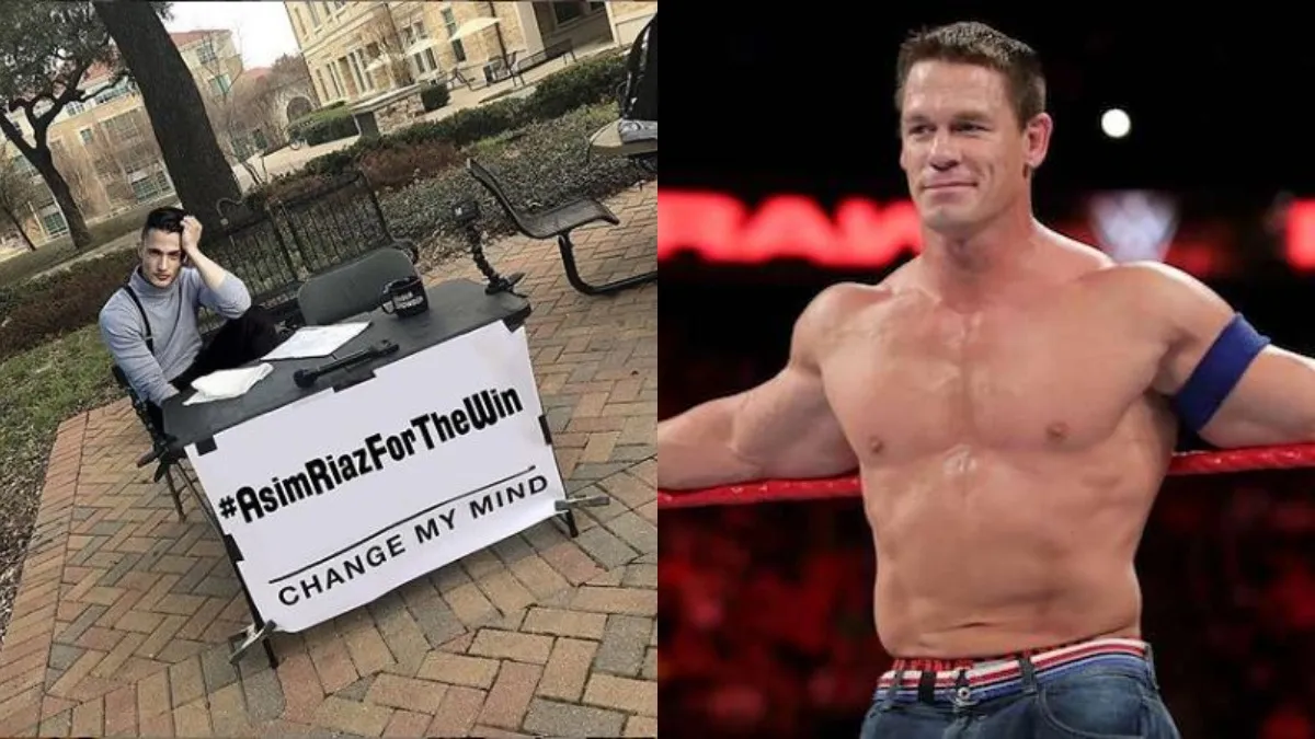 WWE स्टार जॉन सीना के आसिम फेवरेट कंटेस्टेंट हैं। उन्होंने आसिम की एक तस्वीर शेयर की है जिसमें वह एक कुर्सी पर बैठे हुए और उनके आगे एक टेबिल पर लिखा है-#AsimRiazForThewin।