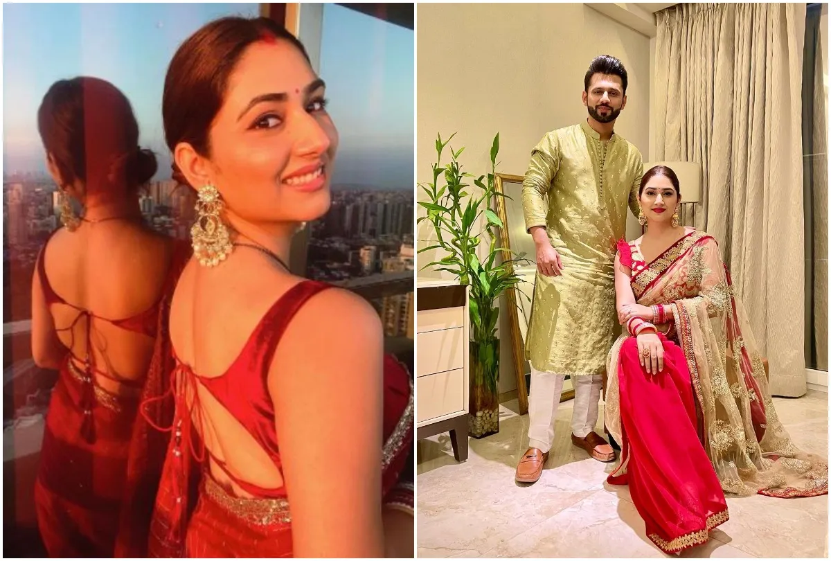 दिशा परमार ने अपने पहले करवा चौथ पर सुर्ख लाल रंग की साड़ी पहनीं। इसके साथ ही डीप नेक ब्लाउज, कान में बड़े बड़े झुमके और बन उन पर काफी सूट कर रहा था। वहीं राहुल ने हल्के हरे रंग की शेरवानी पहनी हुई है। तस्वीरों में दोनों मेड फॉर ईच अदर कपल लग रहे हैं।