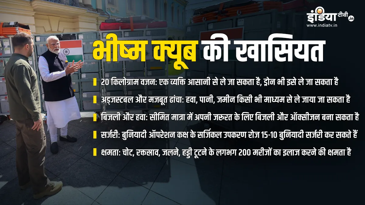प्रधानमंत्री नरेन्द्र मोदी ने शुक्रवार (23 अगस्त) को यूक्रेन की अपनी यात्रा के दौरान राष्ट्रपति वोलोदिमीर जेलेंस्की से मुलाकात की और यूक्रेन सरकार को चार भीष्म (भारत स्वास्थ्य सहयोग हित और मैत्री पहल) क्यूब्स भेंट किए। यूक्रेन के राष्ट्रपति वोलोडिमिर जेलेंस्की ने क्यूब्स की मानवीय सहायता के लिए प्रधानमंत्री को धन्यवाद दिया, जिससे घायलों के उपचार में तेजी आएगी और बहुमूल्य जीवन बचाने में मदद मिलेगी। यहां हम बता रहे हैं कि ये भीष्म क्यूब क्या हैं और कैसे ये यूक्रेन की मदद करेंगे।