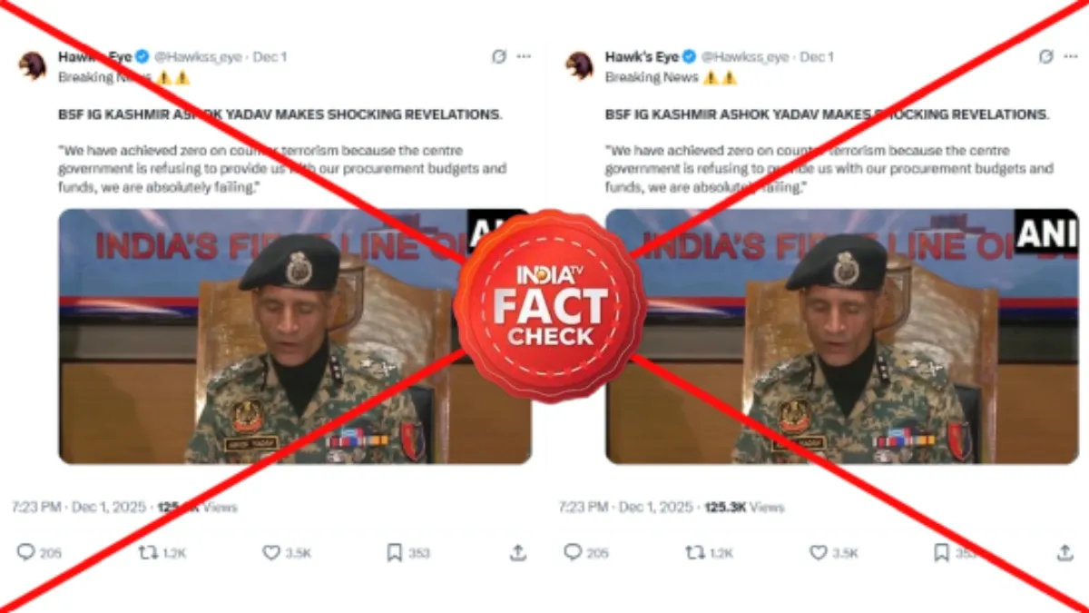 एक X हैंडल ने 1 दिसंबर को बीएसएफ कश्मीर फ्रंटियर आईजी अशोक यादव का एक वीडियो शेयर किया, जिसमें वह आतंकवाद के खिलाफ अपनी सेना की नाकामी पर बात करते नजर आ रहे हैं। इस वीडियो में मीडिया से बात करते हुए बीएसएफ अधिकारी ने कथित तौर पर दावा किया कि 2025 में कोई भी आतंकवादी नहीं मारा गया। इसके साथ ही यह भी कहा कि 100-120 टेररिस्ट लाइन ऑफ कंट्रोल पार कर चुके हैं और शायद पहले से ही भारतीय इलाके में पहुंच चुके हैं। इस वीडियो में वह अपनी नाकामी का ठीकरा केंद्र सरकार पर फोड़ते नजर आ रहे हैं। उनका कहना है कि केंद्र सरकार ने प्रोक्योरमेंट बजट और फंड देने से मना कर दिया था। इस वजह से सेना आतंकवादियों पर काबू पाने में नाकाम रही है।