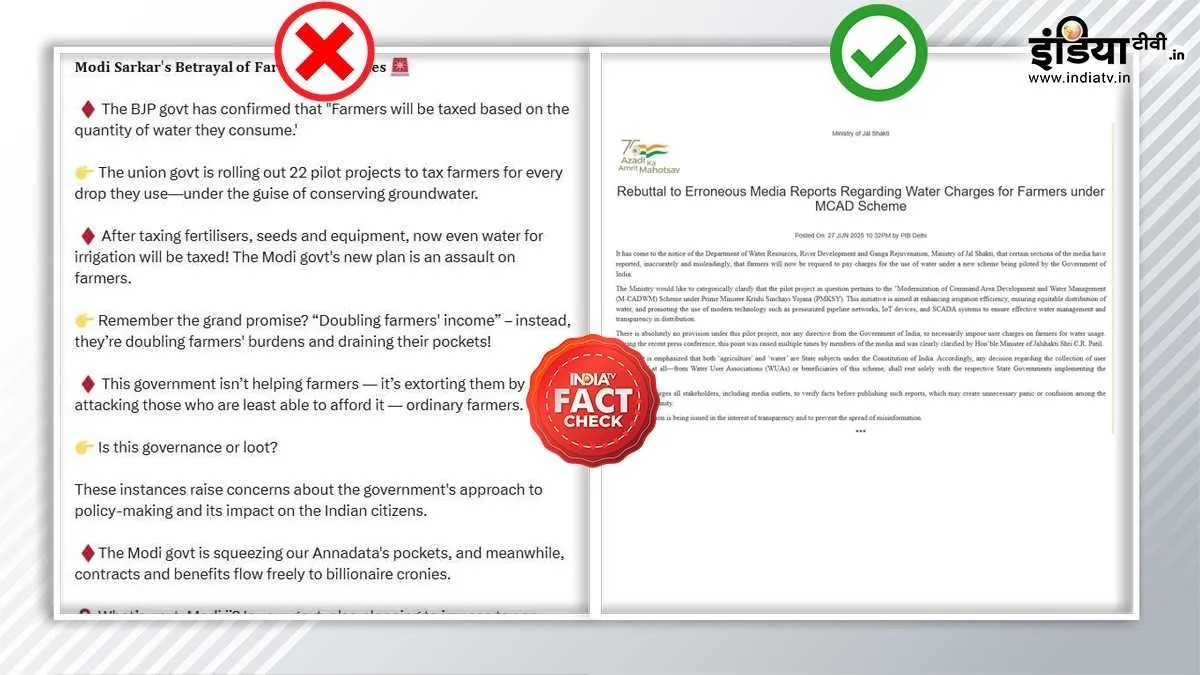 कई सोशल मीडिया पोस्ट में दावा किया गया है कि केंद्र सरकार कृषि उद्देश्यों के लिए पानी के उपयोग पर टैक्स लगाने की योजना बना रही है। कांग्रेस ने भी सोशल मीडिया प्लेटफॉर्म एक्स पर लिखा, 'भाजपा सरकार ने पुष्टि की है कि किसानों पर उनके द्वारा खपत किए जाने वाले पानी की मात्रा के आधार पर टैक्स लगाया जाएगा।' साथ ही कांग्रेस ने एक्स पर कहा कि केंद्र सरकार भूजल संरक्षण की आड़ में किसानों द्वारा उपयोग की जाने वाली प्रत्येक बूंद पर टैक्स लगाने के लिए 22 पायलट परियोजनाएं शुरू कर रही है।