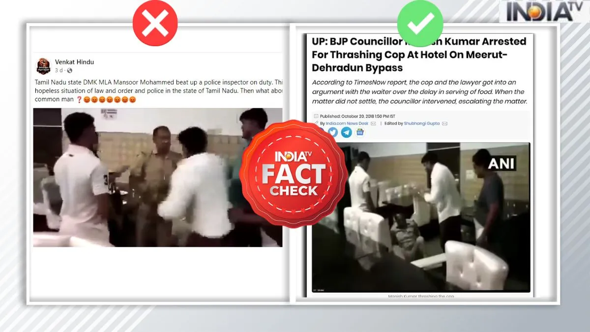 India Tv की ओर से किए गए फैक्ट चेक में सामने आया है कि यह वीडियो साल 2018 का है और पुलिसकर्मी की पिटाई करने वाला व्यक्ति तमिलनाडू का नहीं बल्कि उत्तर प्रदेश के मेरठ से भारतीय जनता पार्टी का पार्षद है। फैक्ट चेक में ये दावा पूरी तरह से फर्जी पाया गया है।
