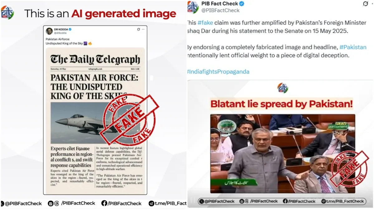 सोशल मीडिया पर अखबरा की क्लिपिंग जो वायरल हो रही है उसे लेकर प्रेस इन्फॉर्मेशन ब्यूरो यानी पीआईबी ने फैक्ट चेक किया। पीआईबी के फैक्ट चेक में यह जानकारी सामने आई कि यह वायरल क्लिपिंग पूरी तरह से मनगढंत तस्वीर और शीर्षक साथ शेयर किया जा रहा है, जो पाकिस्तान का समर्थन करना है। पीआईबी ने अपने फैक्ट चेक में पाया कि अखबार की क्लिपिंग शेयर करके जो दावा किया जा रहा है, वह पूरी तरह से फर्जी है और प्रसारित की जा रही तस्वीर एआई द्वारा जनरेट की गई है। 10 मई 2025 को द टेलीग्राफ द्वारा ऐसा कोई लेख प्रकाशित ही नहीं किया गया था।