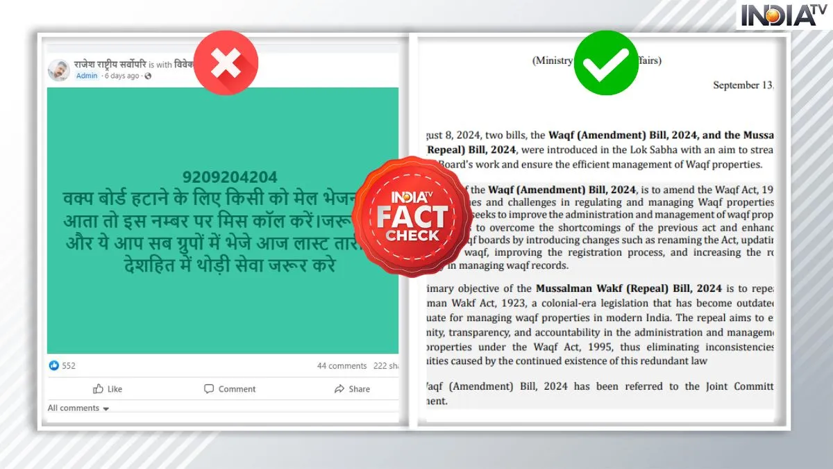 वक्फ संशोधन बिल को संयुक्त संसदीय समिति (जेपीसी) को भेजा गया है। इसे लेकर जेपीसी की तरफ से आम जानता से राय या सुझाव मांगे गए हैं। ऐसे हम नहीं कह रहे हैं बल्कि सोशल मीडिया पर दावा किया जा रहा है। सोशल मीडिया के अलग-अलग प्लैटफॉर्म्स पर यूजर्स द्वारा एक मोबाइल नंबर शेयर किया जा रहा है। मोबाइल नंबर शेयर कर यह दावा किया जा रहा है कि इस नंबर को सरकार ने जारी किया है। इस नंबर पर मिस्ड कॉल देकर वक्फ संशोधन बिल के पक्ष में वोट कर सकते हैं और वक्फ बोर्ड को समाप्त किए जाने की मांग का समर्थन किया जा सकता है। हालांकि जब इंडिया टीवी ने इस तथ्य की जांच की तो यह खबर फर्जी साबित हुआ है।