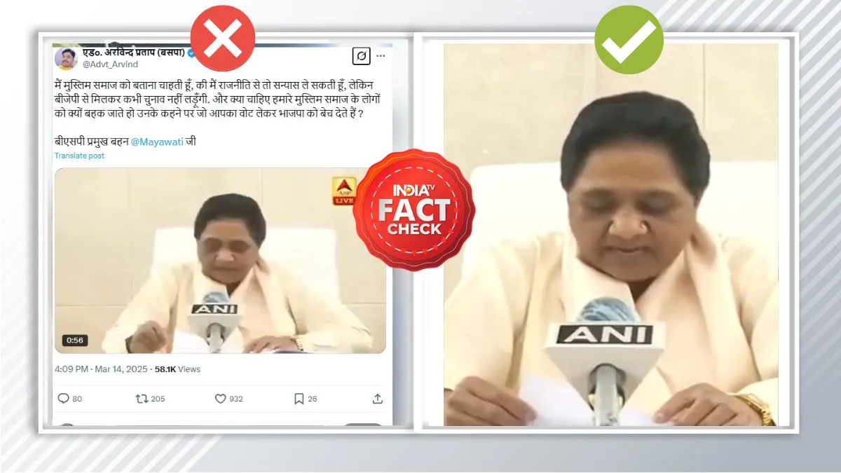 India TV Fact Check: सोशल मीडिया पर उत्तर प्रदेश की पूर्व मुख्यमंत्री और बसपा सुप्रीमो मायावती का एक वीडियो तेजी से वायरल हो रहा है। इसमें मायावती राजनीति में सन्यास लेने लेकिन भाजपा का साथ मंजूर न होने की बात कर रही हैं। लेकिन इंडिया टीवी ने जब इस दावे की पड़ताल की तो पता चला कि मायावती का यह वीडियो साल 2020 का है। ये वीडियो उस समय की है जब यूपी की 7 सीटों पर एमएलसी चुनाव होने वाले थे। उस दौरान 29 अक्तूबर 2020 को उन्होंने समाजवादी पार्टी को उसके दलित विरोधी कृत्यों का हवाला देते हुए उसे हराने के लिए भाजपा या किसी अन्य पार्टी को समर्थन देने की बात कही थी। हालांकि इस बयान के बाद मायावती ने दूसरे बयान जारी करते हुए कहा था कि मुस्लिम समाज के लोगों को मैं यह बताना चाहती हूं कि राजनीति से मैं सन्यास ले लूंगी लेकिन भाजपा के साथ मिलकर चुनाव नहीं लड़ूंगी।