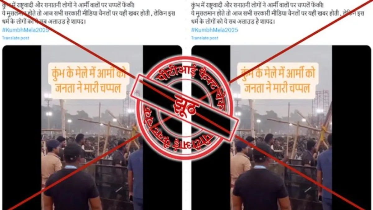 सोशल मीडिया पर दावा किया गया है कि प्रयागराज में चल रहे महाकुंभ मेले के दौरान भीड़ ने सेना पर चप्पल फेंकी। हालांकि, पीटीआई फैक्ट चेक डेस्क की जांच में वायरल दावा फर्जी पाया गया।