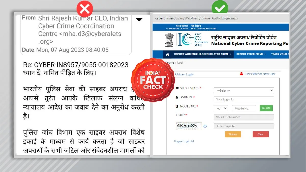 India TV Fact Check: केंद्र सरकार बढ़ते ऑनलाइन अपराध को रोकने के लिए साइबर क्राइम के नाम से एक संस्था चलाती है, जो किसी भी तरह के साइबर फ्रॉड की स्थिति में यूजर्स की मदद करता है और हर संभव समाधान दिलाने की कोशिश करता है। इन दिनों सोशल मीडिया पर कुछ स्क्रीनशॉट शेयर हो रहे हैं, जिसमें यूजर्स को साइबर क्राइम के नाम से एक मेल आया हुआ दिख रहा है, जिसमें विभाग को उचित जवाब ना देने पर कार्रवाई करने की बात कही गई है। उस वायरल स्क्रीनशॉट की आज हम पड़ताल करेंगे और यह जानेंगे कि क्या सच में साइबर क्राइम के तरफ से ऐसा कोई मेल भेजा जा रहा है।