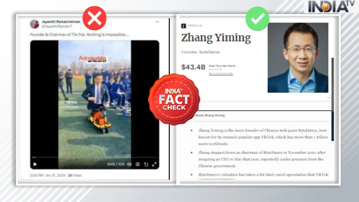 एक वीडियो में झूठा दावा किया गया है कि फुटेज में दिखाया गया एक विशेष रूप से सक्षम व्यक्ति लोकप्रिय चीनी सोशल मीडिया प्लेटफॉर्म टिकटॉक का संस्थापक है। इंडिया टीवी की फैक्ट चेक टीम ने एक व्यापक जांच की है, जिसमें इन दावों को खारिज किया गया है और उस व्यक्ति की पहचान चीनी प्रेरक वक्ता चेन झोउ के रूप में की गई है, जो टिकटॉक से संबद्ध नहीं है। वायरल वीडियो में दो क्लिप हैं- एक में बच्चों के साथ आदमी की बातचीत को दिखाया गया है और दूसरे में उसे वयस्कों की भीड़ को संबोधित करते हुए दिखाया गया है। जब वीडियो को एक्स (पूर्व में ट्विटर) और फेसबुक जैसे सोशल मीडिया प्लेटफॉर्म पर साझा किया गया तो उसके साथ भ्रामक कैप्शन, जैसे "टिक-टोक के संस्थापक और अध्यक्ष। कुछ भी असंभव नहीं है..." लिखा गया।