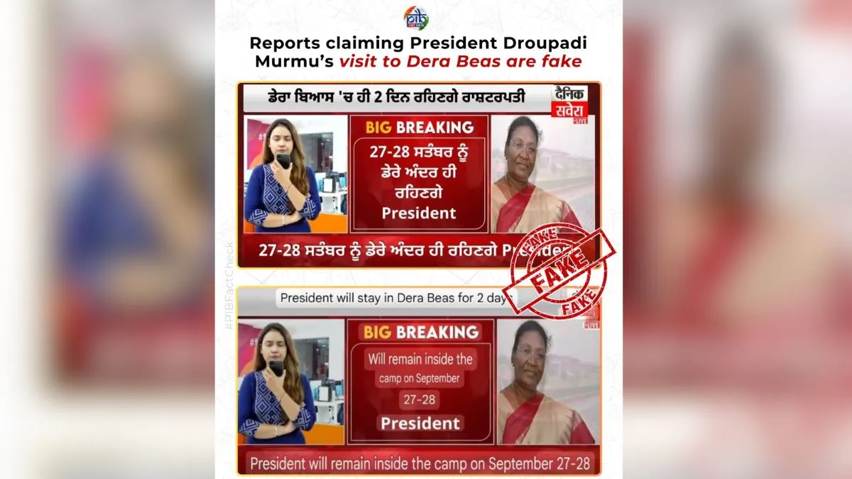 सोशल मीडिया प्लेटफॉर्म यूट्यूब के दैनिक सवेरा नामक एक चैनल का दावा है कि राष्ट्रपति द्रौपदी मुर्मू 27-28 सितंबर को दो दिनों के लिए पंजाब के डेरा ब्यास का दौरा करेंगी। यह दावा सोशल मीडिया पर आग की तरह फैल रहा है।