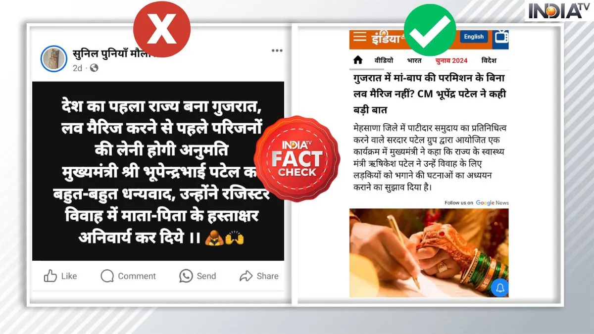 सोशल मीडिया पर हर रोज ऐसी कई खबरें और दावे वायरल होते रहते हैं जिनका सच्चाई से कोई नाता नहीं होता है। हालांकि, आम यूजर्स आसानी से फेक न्यूज का शिकार हो जाते हैं और इन खबरों को आगे शेयर कर देते हैं। ऐसे ही फेक न्यूज से आपको सावधान करने के लिए हम लेकर आते हैं India Tv Fact Check। आज के फेक न्यूज का मामला आया है गुजरात का। सोशल मीडिया पर ऐसी कई पोस्ट जमकर वायरल हो रही है जिसमें दावा किया जा रहा है कि गुजरात की भूपेंद्र पटेल सरकार ने प्रेम विवाह के मामले में परिजनों की अनुमति को अनिवार्य कर दिया है। हालांकि, जब हमने इस मामले की पड़ताल की तो ये दावा भ्रामक साबित हुआ है।