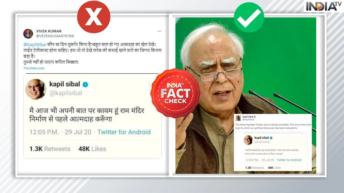 India Tv Fact Check: सोशल मीडिया प्लेटफॉर्म्स पर फेक न्यूज और भ्रामक पोस्ट आज के दौर में धड़ल्ले से वायरल होते रहते हैं। फेक न्यूज फैलाने वाले लोग बड़े-बड़े नेताओं के नाम पर भी झूठी खबरें शेयर करते रहते हैं। आम लोग भी आसानी से इन फेक न्यूज का शिकार होकर इसे आगे बढ़ा देते हैं। ऐसे ही फेक न्यूज से आपको सावधान करने के लिए हम लेकर आते हैं India Tv Fact Check। फेक न्यूज का ये मामला जुड़ा है मशहूर वकील और नेता कपिल सिब्बल से। उनके नाम से एक पोस्ट का स्क्रीनशॉट सोशल मीडिया पर वायरल है जिसमें वह राम मंदिर बनने पर आत्मदाह की बात कह रहे हैं। हालांकि, India Tv के फैक्ट चेक में ये दावा पूरी तरह से फर्जी साबित हुआ है। आइए जानते हैं ये पूरा मामला।