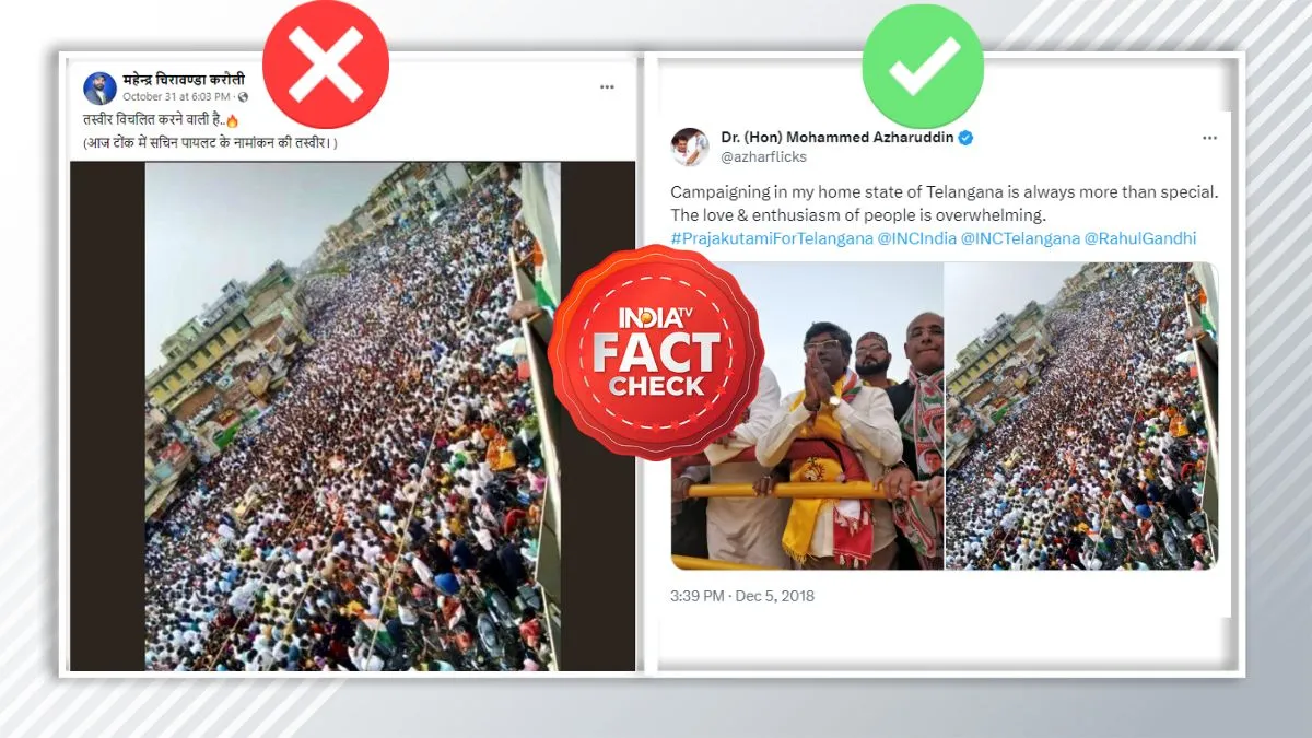 India TV Fact Check: राजस्थान समेत देश के पांच राज्यों में विधानसभा चुनाव चल रहे हैं। ऐसे में सोशल मीडिया पर राजनैतिक दलों और नेताओं को लेकर भारी मात्रा में फर्जी और भ्रामक सूचना फैलाई जा रही है। इसी तरह की एक वायरल फोटो हमें मिली जिसमें विशाल जनसमूह दिखाई पड़ रहा है। इस तस्वीर के साथ दावा है कि ये भीड़ कांग्रेस नेता सचिन पायलट के नामांकन के दौरान की रैली की है। बता दें कि सचिन पायलट ने राजस्थान की टोंक विधानसभा सीट से अपना नामांकन दाखिल कर दिया है। जब हमने इस वायरल फोटो का फैक्ट चेक किया तो ये साल 2018 की तेलंगाना में कांग्रेस के एक रोड शो की तस्वीर निकली।