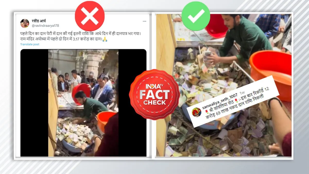 India TV Fact Check: अयोध्या में राम मंदिर की प्राण-प्रतिष्ठा के बाद इतनी बड़ी संख्या में श्रद्धालु पहुंच रहे हैं कि शायद ही किसी ने इसकी कल्पना की हो। आलम ये रहा कि पहले ही दिन 5 लाख के करीब लोगों ने भगवान राम के दर्शन किए। इसी बीच सोशल मीडिया पर एक वीडियो वायरल हो रहा है, जिसके साथ दावा किया जा रहा है कि ये अयोध्या के राम मंदिर में श्रद्धालुओं द्वारा दिया दान है। वीडियो में एक बड़ी सी दान पेटी नोटों से भरी है। जब हमने इस वीडियो का फैक्ट चेक किया तो पता चला कि ये अयोध्या का नहीं बल्कि राजस्थान के एक मंदिर का है।