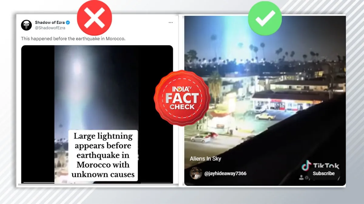 India TV Fact Check: मोरक्को के एटलस पर्वतमाला क्षेत्र के सुदूर पहाड़ी गांवों और कस्बों में आए भीषण भूकंप में 3000 से ज्यादा लोग मारे गए हैं और 2,000 से ज्यादा घायल बताए जा रहे हैं। वहां पर मलबे के बीच फंसी जानों को अभी भी तलाशा जा रहा है। मोरक्को में आए विनाशकारी भूंकप के बाद सोशल मीडिया पर सैंकड़ों वीडियो वायरल होने लगे। इनमें से कई सार गलत और भ्रामक भी हैं। ऐसा ही एक वीडियो हमारे सामने आया जिसमें ये दावा किया जा रहा है कि मोरक्को में भूकंप से कुछ देर पहले आसमान से एक रहस्यमयी बिजली चमकी थी। जब हमने इस वीडियो का फैक्ट चेक किया तो ये पूरी तरह से फर्जी निकला।