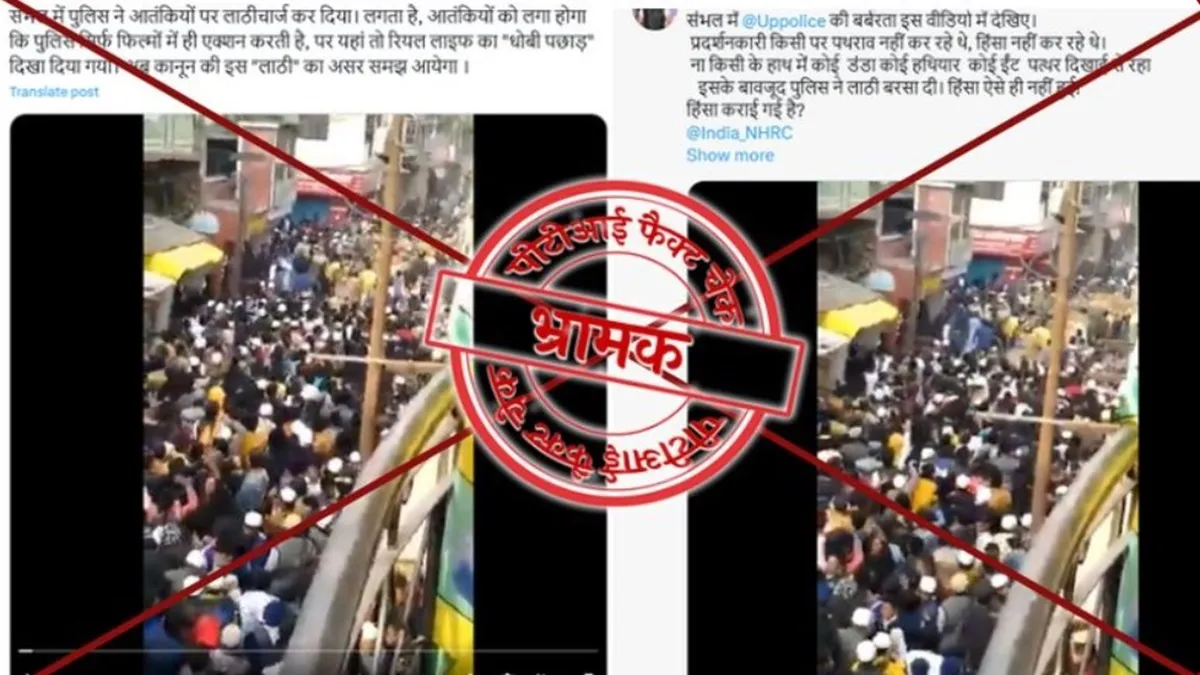 Originally Fact Checked by PTI: सोशल मीडिया के दौर में हर दिन कई फेक न्यूज और फेक वीडियो वायरल होते रहते हैं। आम लोग इन फेक न्यूज पर आसानी से भरोसा कर लेते हैं और इन्हें आगे फॉरवर्ड कर देते हैं। इन्हीं फेक न्यूज से आपको सावधान करने के लिए हम लेकर आते हैं फैक्ट चेक। फेक न्यूज का ताजा मामला संभल हिंसा के नाम पर वायरल हो रहे वीडियो से जुड़ा है। सोशल मीडिया पर एक वीडियो बड़े पैमाने पर शेयर किया जा रहा है, जिसमें पुलिस लोगों की भीड़ पर लाठीचार्ज करती दिखाई दे रही है। इस वीडियो को यूजर्स उत्तर प्रदेश के संभल में जामा मस्जिद के पास हुई हालिया हिंसा से जोड़कर शेयर कर रहे हैं।