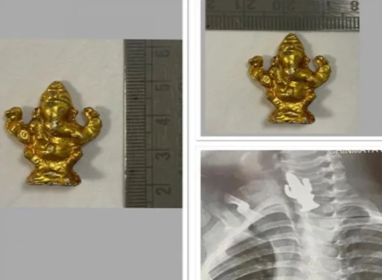 बेंगलुरु: कर्नाटक के बेंगलुरु में एक तीन साल के बच्चे ने लगभग 5 सेंटीमीटर की लंबाई वाले भगवान गणेश की मूर्ति को निगल गया, लेकिन समय पर इलाज होने के चलते उसे बचा लिया गया। तीन साल के बसावा को शुक्रवार ओल्ड एयरपोर्ट रोड पर स्थित मनिपाल हॉस्पिटल में ले जाया गया। बच्चे ने खेलने के दौरान मूर्ति को निगल लिया था। इसके बाद उसकी छाती में दर्द होना शुरू हो गया और लार तक निगलने में परेशानी होने लगी थी। पहले उसका एक्स-रे कराया गया, जिसमें दिखा कि मूर्ति आखिर किस हिस्से में फंसी हुई है।