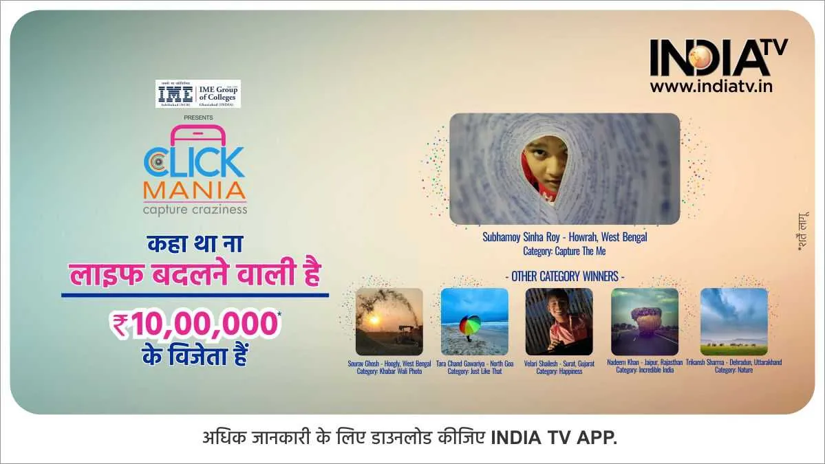 Capture The Me कैटेगिरी के विजेता शुभामय सिन्हा रॉय ही India TV CLICK MANIA प्रतियोगिता के ओवरऑल विजेता भी हैं और वे कुल मिलाकर इस प्रतियोगिता में 7.5 लाख रुपए इनाम के हकदार हैं।