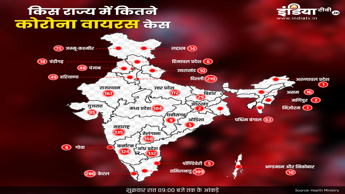बात अगर राज्यों की करें तो आंध्र प्रदेश में अब तक 132, अंडमान निकोबार में 10, अरुणाचल प्रदेश में 1, असम में 16, बिहार में 29, चंडीगढ़ में 18, छत्तीसगढ़ में 9, दिल्ली में 219, गोवा में 6, गुजरात में 95, हरियाणा में 49, हिमाचल में 6, जम्मू-कश्मीर में 75, झारखंड में 2, कर्नाटक में 124, केरल में 286, लद्दाख में 14, मध्य प्रदेश में 104, महाराष्ट्र में 335, मणिपुर में 2, मिजोरम में 1, ओडिशा में 5,पंजाब में 48, राजस्थान में 167, तमिलनाडु में 309, तेलंगाना में 158, उत्तराखंड में 10, यूपी में 172 और बंगाल में 63 मामले सामने आ चुके हैं।
