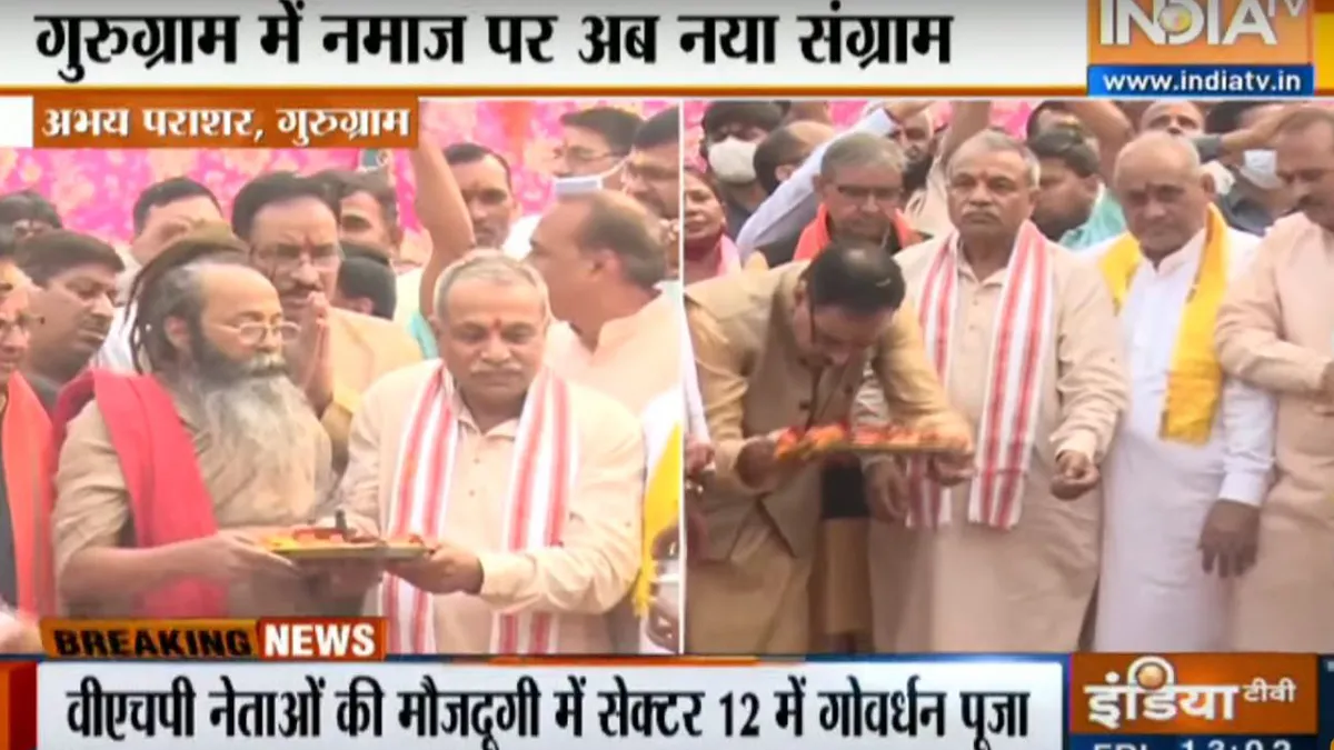 गुरुग्राम: हरियाणा के गुरुग्राम में जिन 8 जगहों पर खुले में नमाज करने की रोक लगाई गई है उनमें से एक जगह पर आज विश्व हिंदू परिषद ने गोवर्धन पूजा का आयोजन किया है। शहर में पहले 37 जगहों पर खुले में नमाज की अनुमति थी लेकिन कुछ जगहों पर स्थानीय लोगों के विरोध की वजह से 8 जगहों पर नमाज की अनुमति रद्द कर दी गई है, उन्हीं में से एक जगह गुरुग्राम के सेक्टर 12 में है जहां पर शुक्रवार को विश्व हिंदू परिषद की तरफ से गोवर्धन पूजा का कार्यक्रम किया गया।